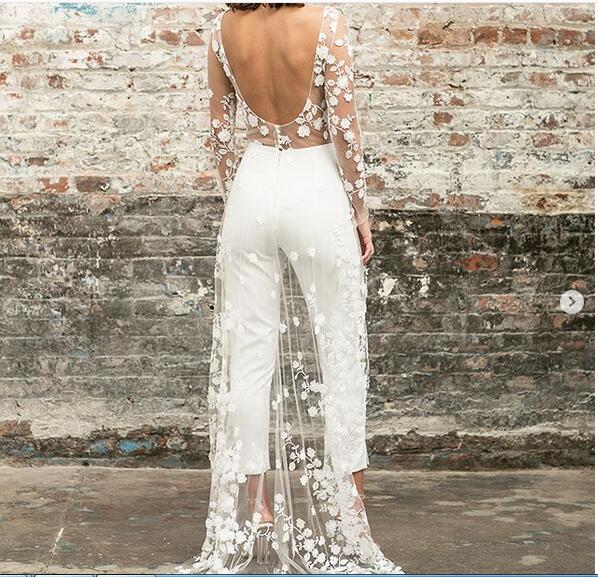 Simple Beach Wedding Dresses Boho Bridal Gowns Sexy Crew Neck Delicate Lace Trousers Wedding Dresses,120