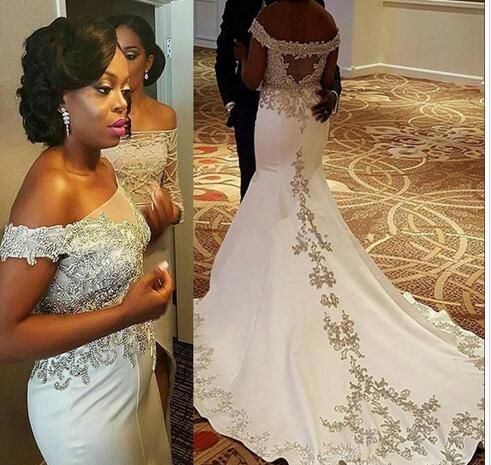 Vintage Off The Shoulder Mermaid Wedding Dresses Sheer Neck Lace Appliques Beads Sexy Back Satin Bridal Dress African Wedding Gowns,290