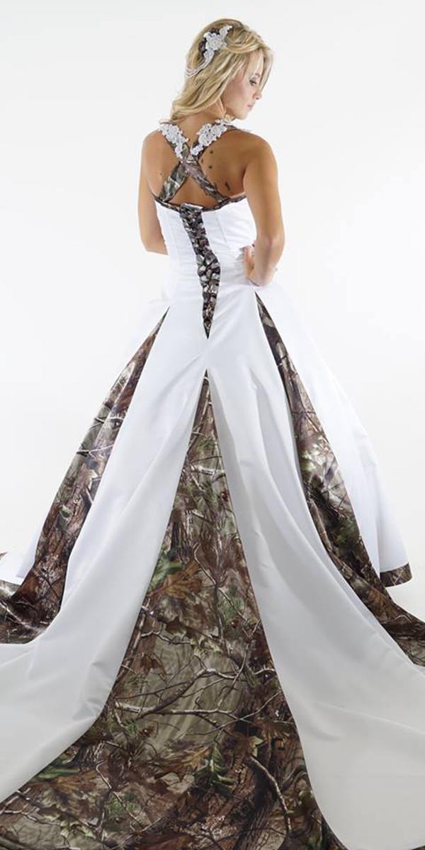 2021 Embroidery Ball Gown Camo Wedding Dresses,Long Train Bridal Gowns,Criss Cross Back Real Tree Wedding Dress,348