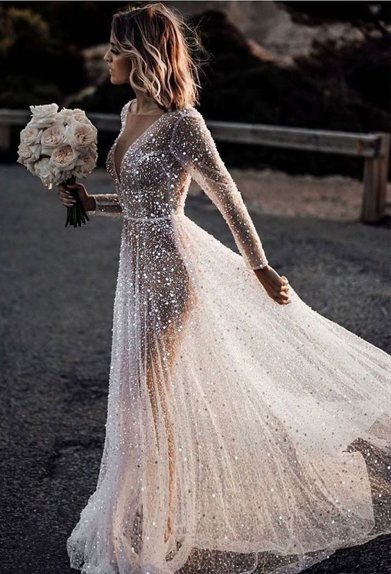 Sparking white See-Through Bing Bling Bridal Dress Long Sleeves Wedding Dresses,356