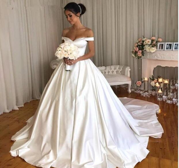 Chic Ivory Satin Wedding Dresses 2021 Princess Ball Bridal Gowns Off The Shoulder Dubai Arabic Bridal Wedding Sweep Train,407