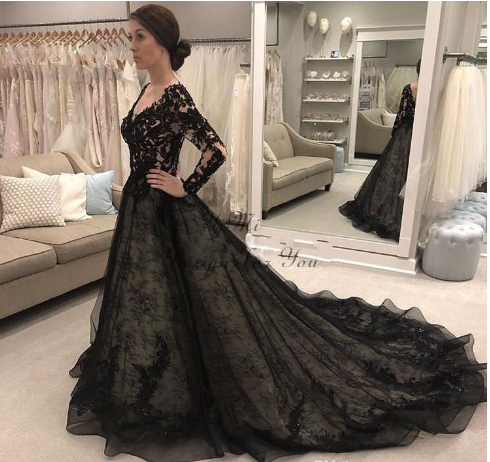 Black Gothic Wedding Dresses Long Sleeve V Neck Backless Sweep Train Lace Illusion Bodice Garden Country Chapel Bridal Gowns,528