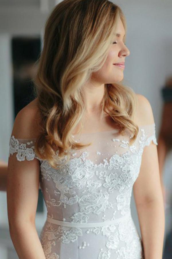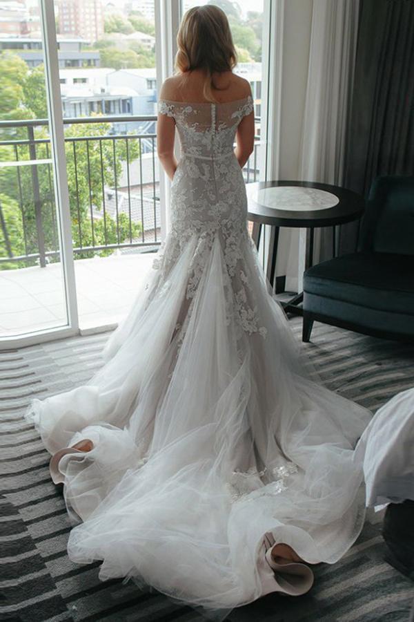 Sheath Off the Shoulder Court Train Ivory Tulle Wedding Dresses with Lace Appliques,603