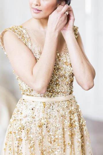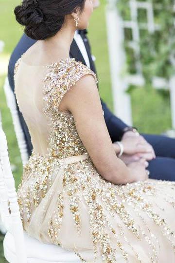 Illusion Neck Beading Long Gold Wedding Dress with Sheer Back Long Prom Dresses,604