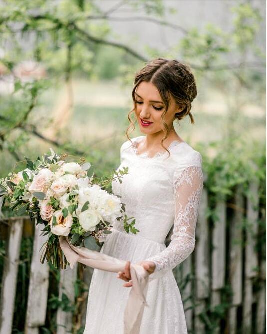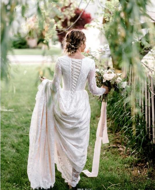 Vintage Lace A-line Modest Wedding Dress With Sheer Long Sleeves Wedding Gown,707