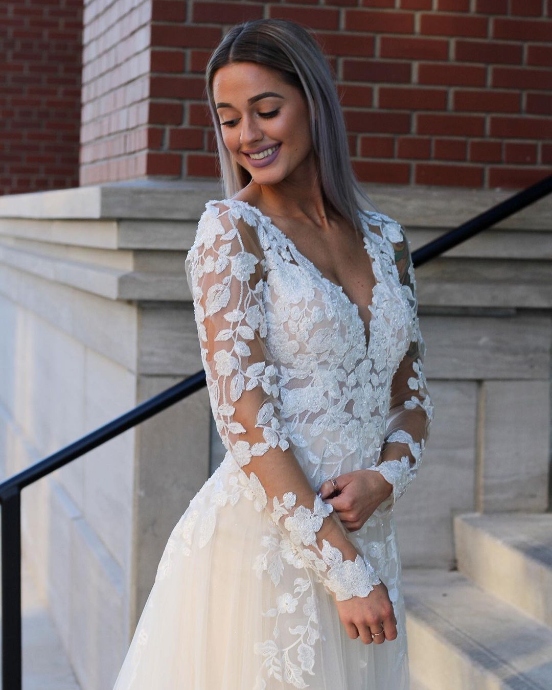 Elegant A Line V Neck Long Sleeves Lace Wedding Dresses,711
