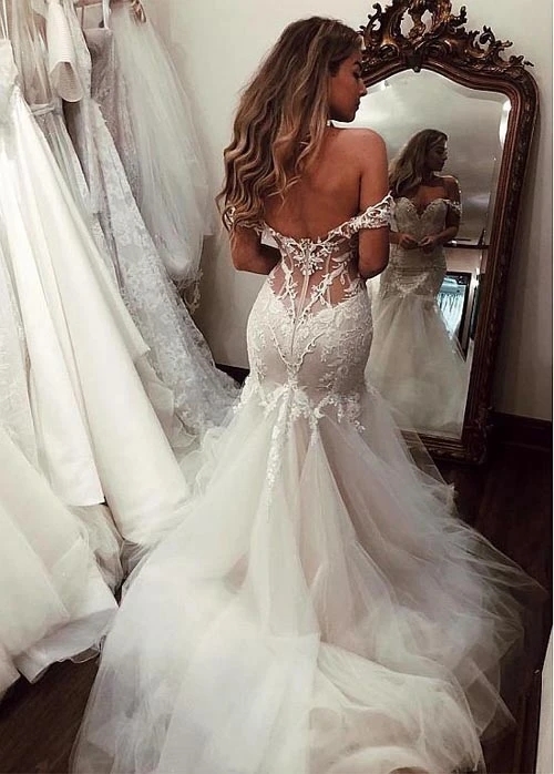 Cheap Off the Shoulder Mermaid Wedding Dresses Vintage Lace Bridal Gown,716