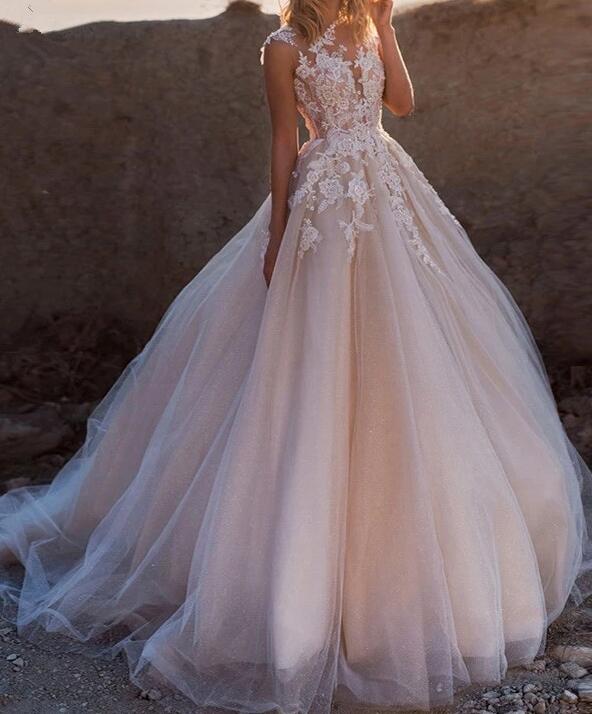 Princess A-Line Blush Pink Tulle Long Wedding Dresses with Appliques,884