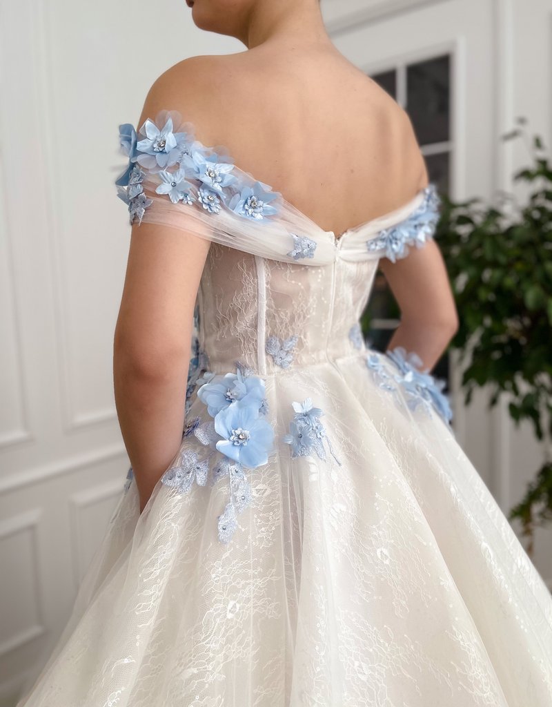 Ivory off the shoulder flowers lace a line prom evening dresses,917