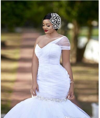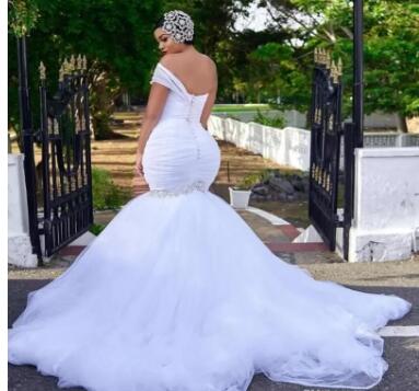 Plus Size Wedding Dresses With One Shoulder Beads Mermaid Wedding Gowns Robe de mariee Beaded Crystals Trumpet Bridal Dress,944