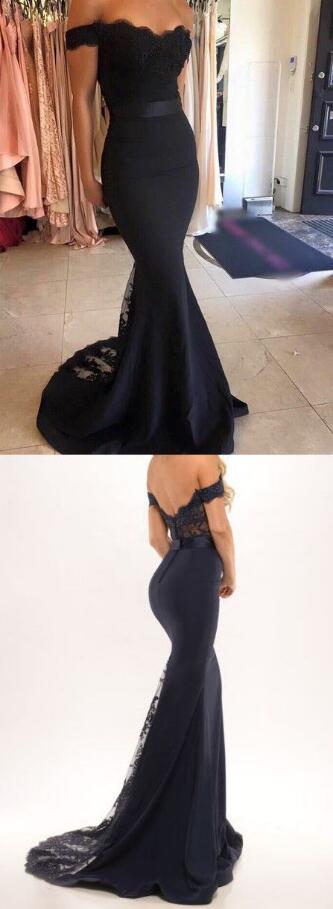Black Off the Shoulder Mermaid Prom Dress, Boat neckline Lace Long Backless Prom Gown, Evening Dress, Formal Women Dress,121