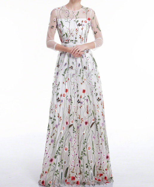 White Prom DressTulle Colorful Floral Embroidery Whimsical Maxi Evening Dress with Sheer 3/4 Sleeves Prom Dress,214