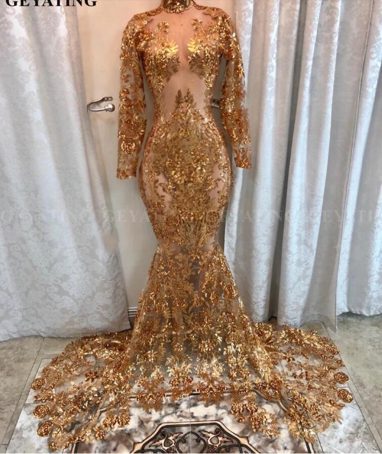 Sparkly Sequin Long Sleeves Mermaid Gold Prom Dresses for Black Girl, See through 2021 Sexy Sheer Lace Appliques African Evening Formal Dress,221