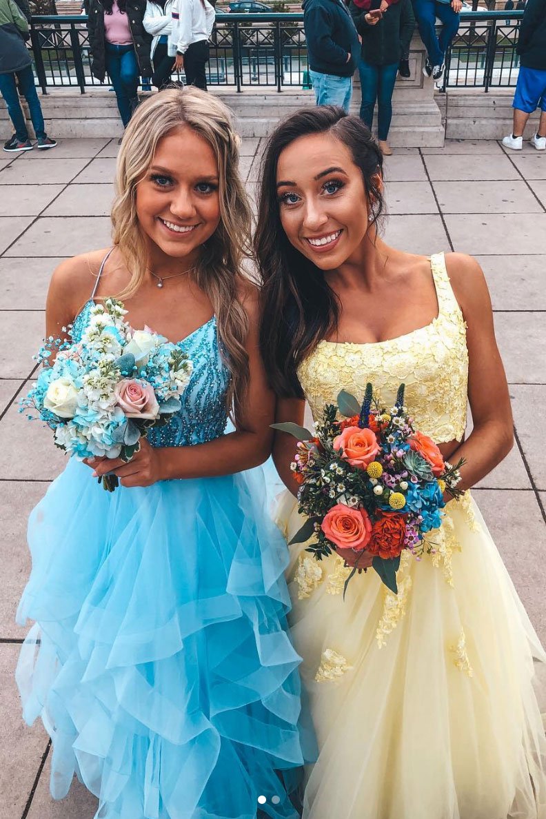 Chic Spaghetti Straps Tulle Two Piece Prom Dresses A-Line 3D Lace Appliques Yellow Prom Dresses Zipper Up Long Formal Dresses,224