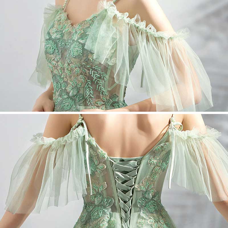Green Princess Gown,Evening Party Dress,Tulle Lace Appliques with Beads Prom Dresses,252