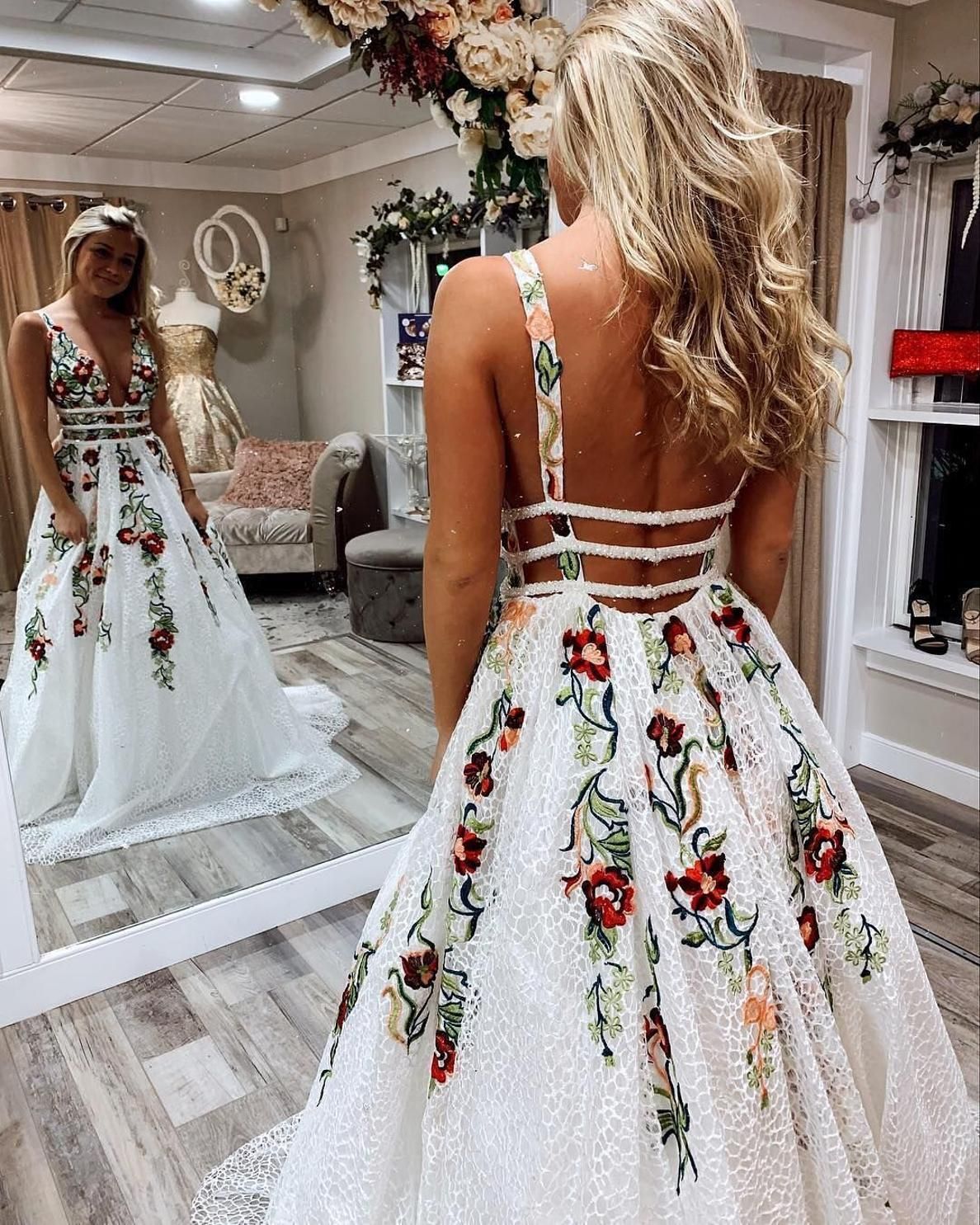 Princess A-line White Long Prom Dress with Floral Embroidery,258