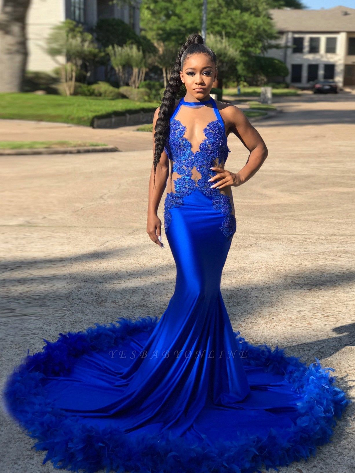 African Feather Prom Dresses 2021,Royal Blue Mermaid Evening Dress,Lace Appliques Sexy Sheer Neck Black Girl Party Gowns,347