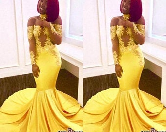 Yellow Lace Long Sleeves Prom Dresses For Black Girls 2021 Appliques Mermaid Evening Dress African Style Sheer Neck Plus Size Party Gowns,353