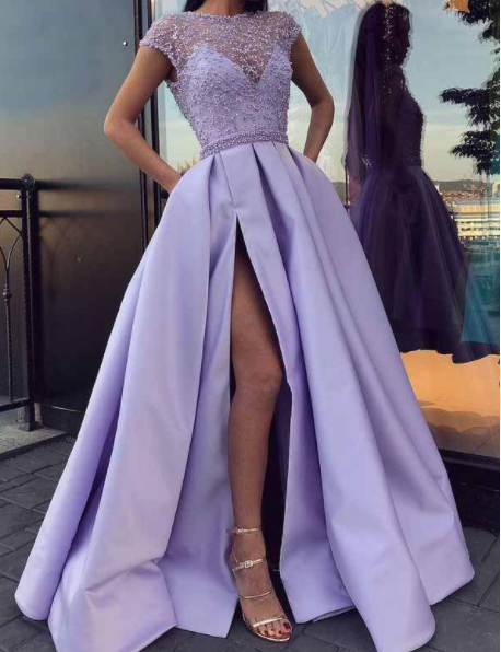 Chic Satin Short Sleeve Scoop Split Beads Purple Slit Open Back Long Prom Dresses ,463