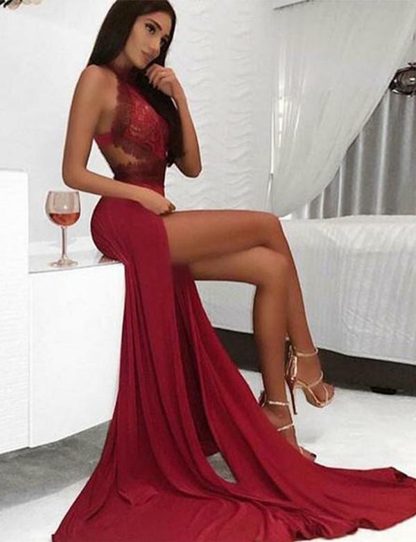Sexy Red Long Prom Dresses High Neck Split Front Evening Dresses,486