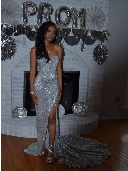 Sexy Mermaid Sweetheart Sweep Train Silver Sequined Prom Dress with Split,Backless Long Prom Dress,507