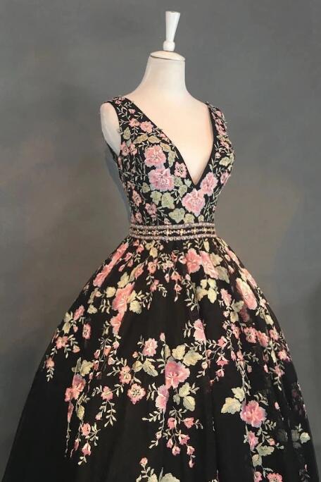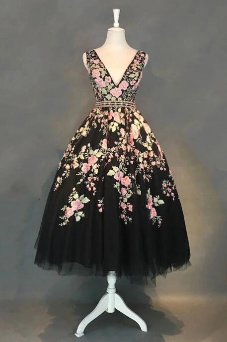 A-line V-neck Floral Tea Length Black Tulle Prom Dresses With Beading,514