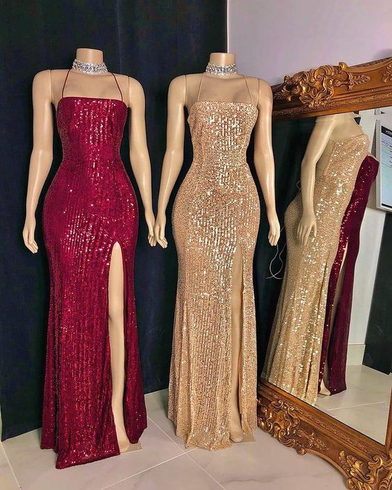 Sexy Mermaid Spaghetti Straps Burgundy Sequins Long Prom Evening Dress with Split,637
