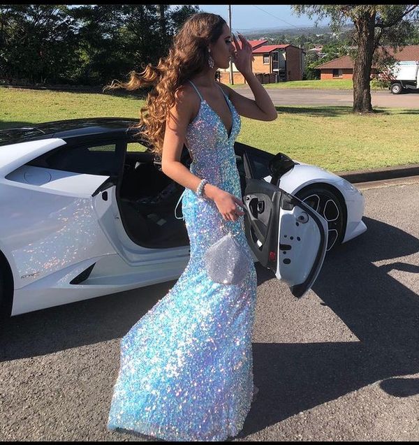 Light Blue Sequins Mermaid V Neck Sparkly Prom Dresses,757