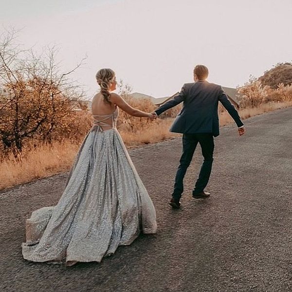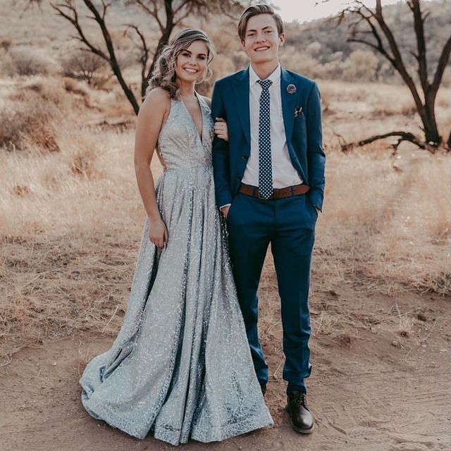 New A-Line Halter Cross Back Silver Long Sparkly Prom Evening Dresses,803
