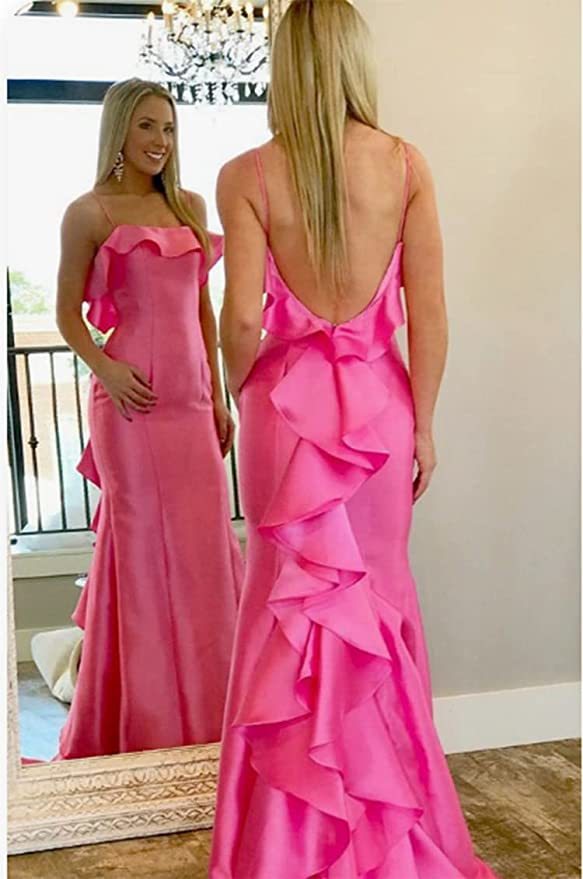 Pink Spaghetti Straps Satin Mermaid Prom Dress With Ruffles,Mermaid Formal Gown,911