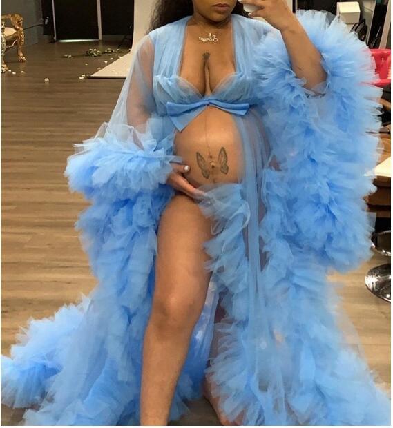 Ruffles Kimono Women Dress Light Sky Blue Robe for Photoshoot Extra Puffy Sleeves Prom Gowns African Cape Cloak Maternity Dress,937