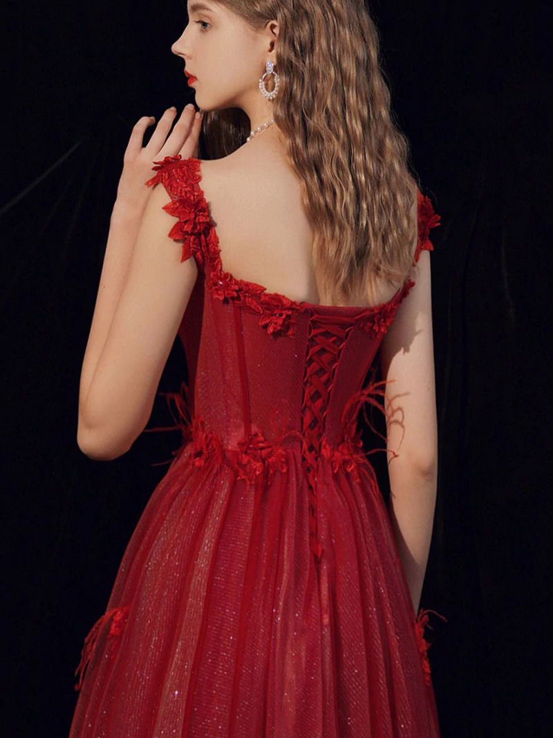 Burgundy A line tulle long prom dress, burgundy evening dress,1058