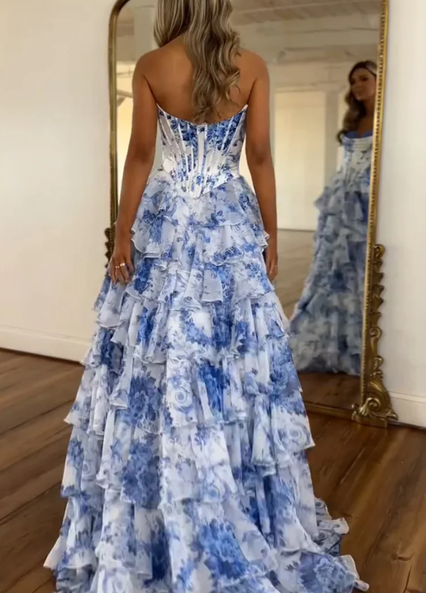 Cute A Line Sweetheart Floral Printed Chiffon Long Prom Dress with Slit,1113