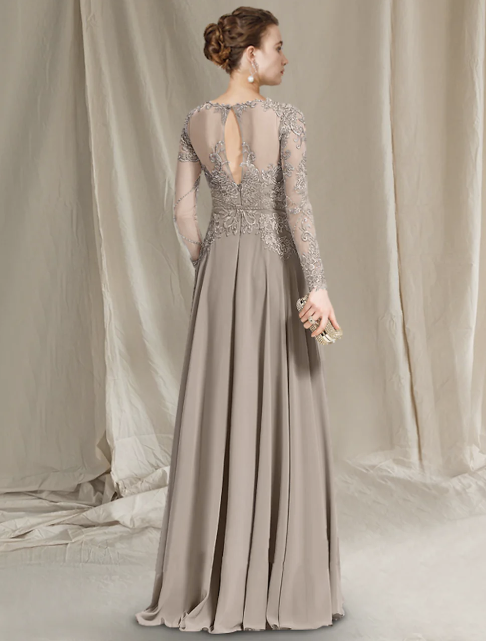A-Line Mother of the Bride Dress Luxurious Elegant Jewel Neck Floor Length Chiffon Lace Long Sleeve with Pleats Appliques,1146