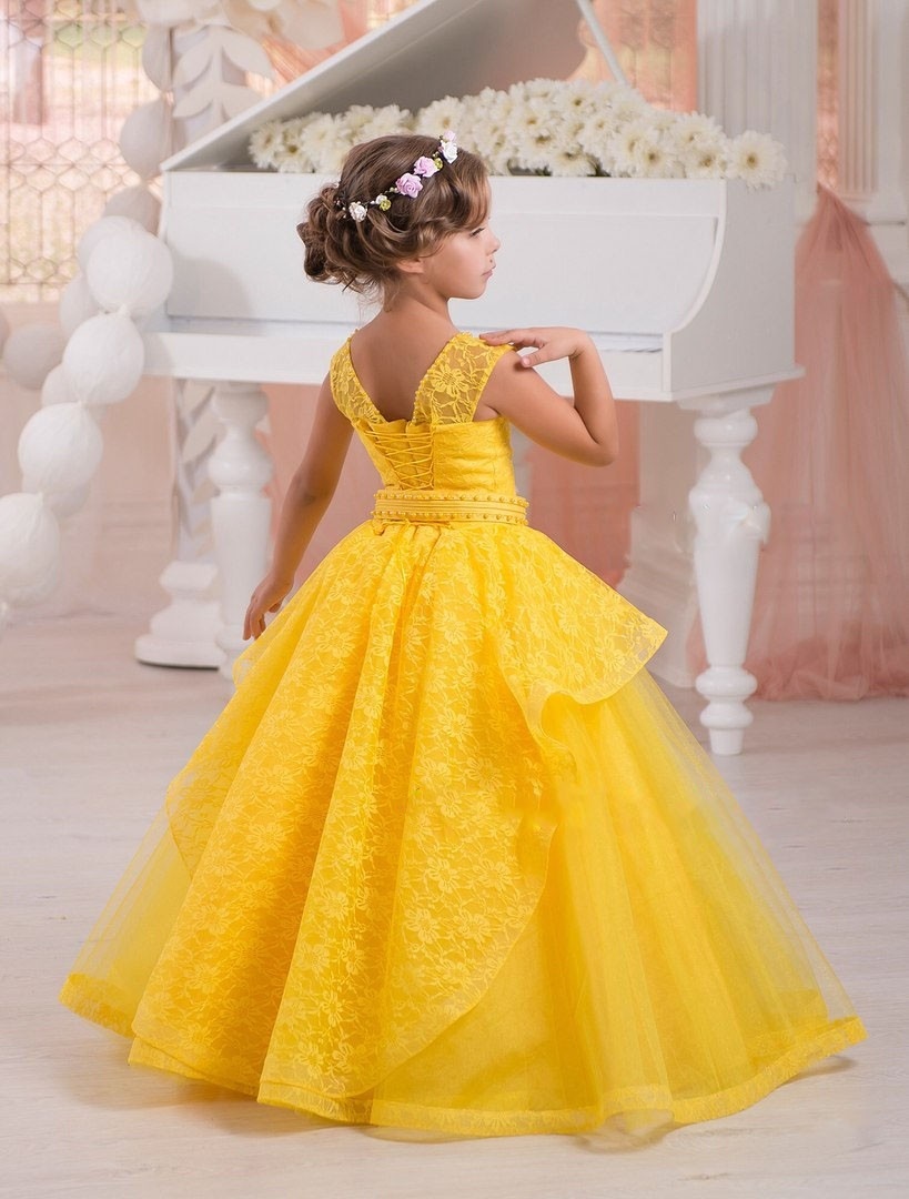 Yellow Lace Ball Gown Court Train Sheer First Communion Dresses for Wedding Girls Formal Dresses Flower Girl Dresses,132