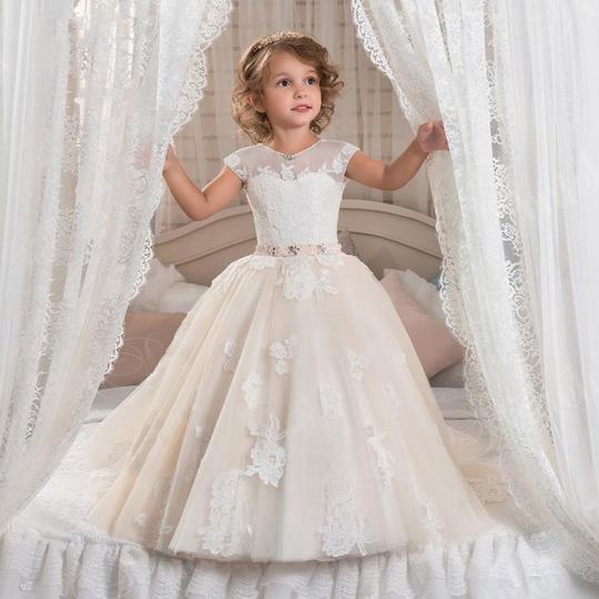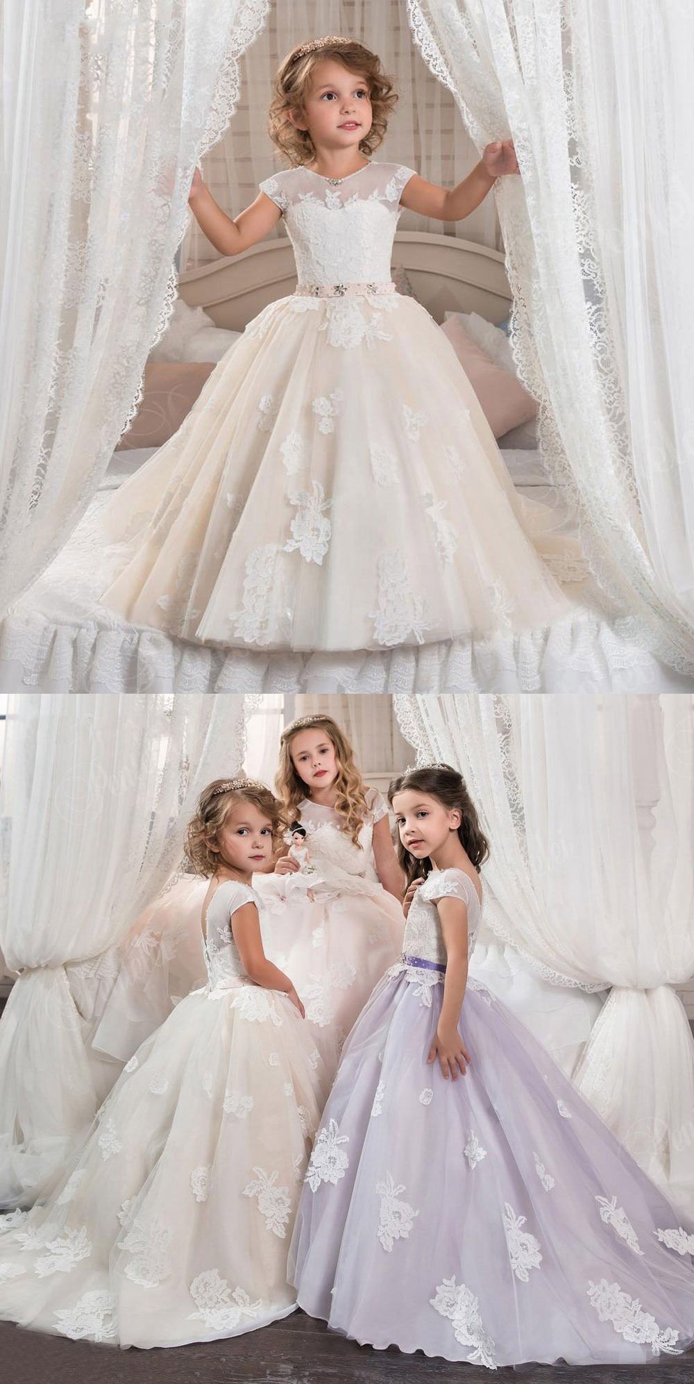 Cute short sleeves long flower girl dress,lace appliques girl dress,138