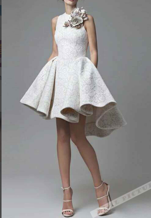 White handmade flowers round neck high-low A-line short prom dress,11,