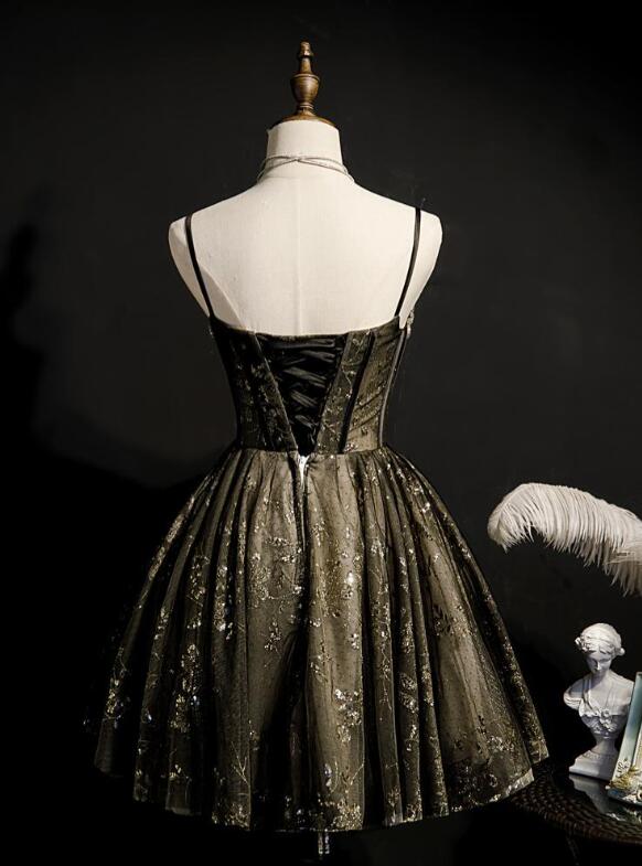 Spaghetti Strap Beaded Black Lace Homecoming Dresses,889