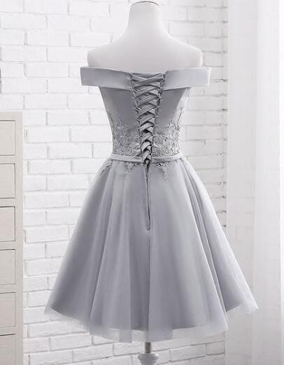 Simple Off Shoulder Grey Tulle Applique Bridesmaid Dresses, Knee Length Formal Dress, Party Dresses,998
