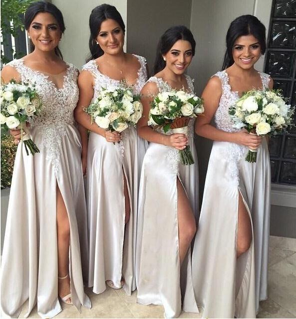 Long bridesmaid Dresses, slit bridesmaid dress, lace bridesmaid dress, light gray bridesmaid dress,451