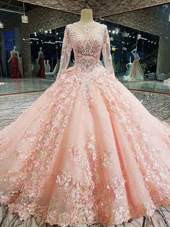 Long Sleeve Appliques Tulle Quinceanera Dresses with Flower, Elegant Beaded Ball Gown Prom Dresses, Formal Evening Dress,73