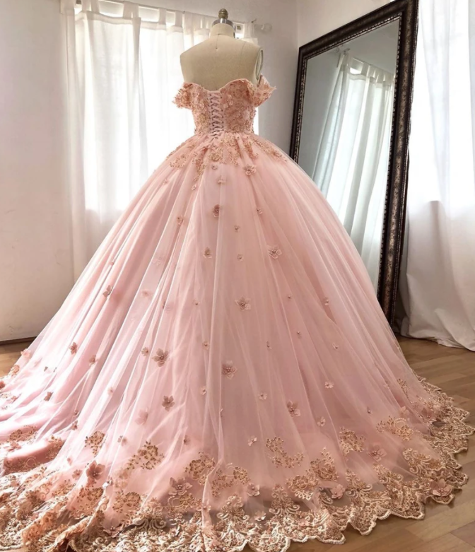 Pink Embroidered Lace Quinceanera Dresses Ball Gowns,636
