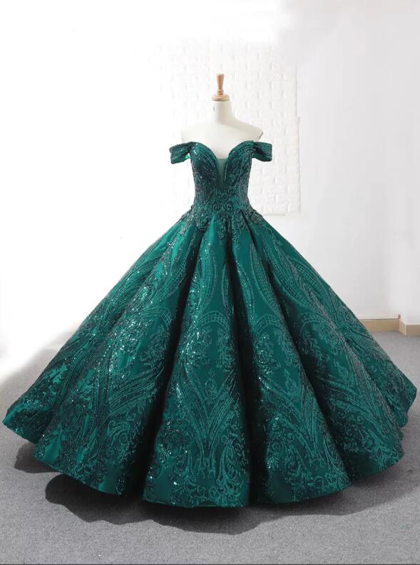 Off Shoulder Prom Gowns Emerald Green Quinceanera Dresses,886