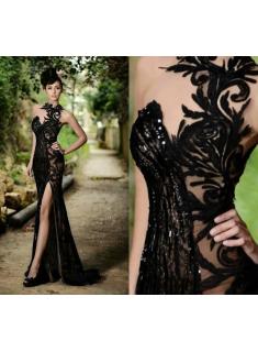 High Neck Black Mermaid Prom Dresses High Slit Applique Bling Bling Evening Gowns,30