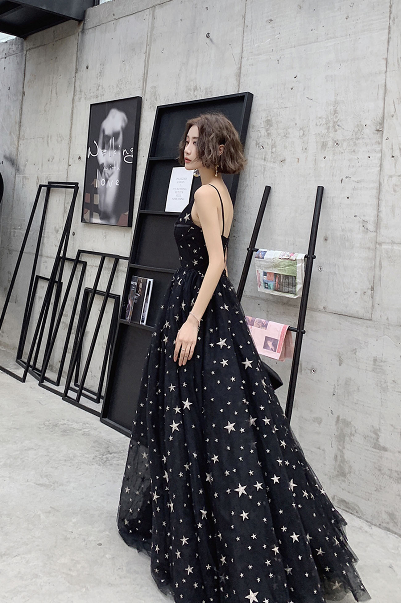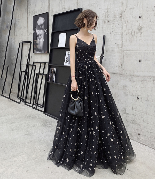 Black tulle long A line prom dress with star,994