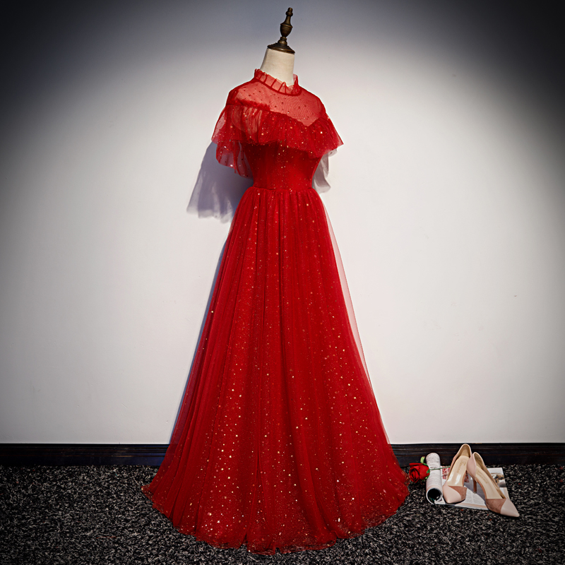 Beautiful Red Sequins Tulle High Neckline Long Shiny Prom Dress, Red Wedding Party Dress,1071