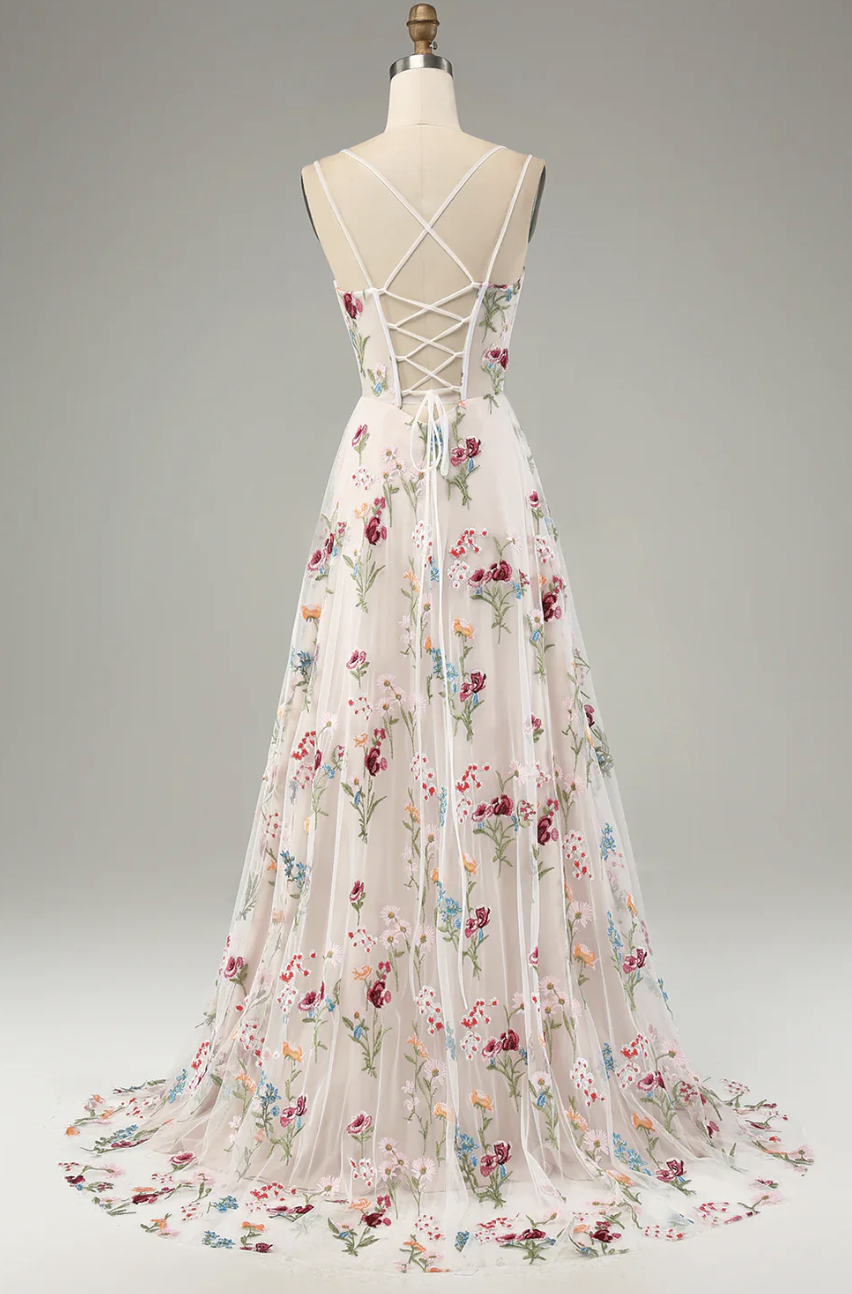 Ivory Flower A-Line Spaghetti Straps Corset Long Prom Dress With Slit,1143