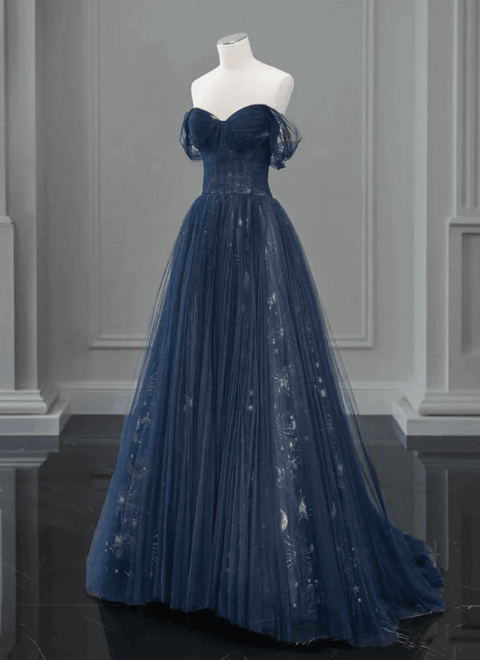 Navy Blue Sweetheart Off Shoulder Tulle Prom Dress A-line Tulle Formal Dress,1145